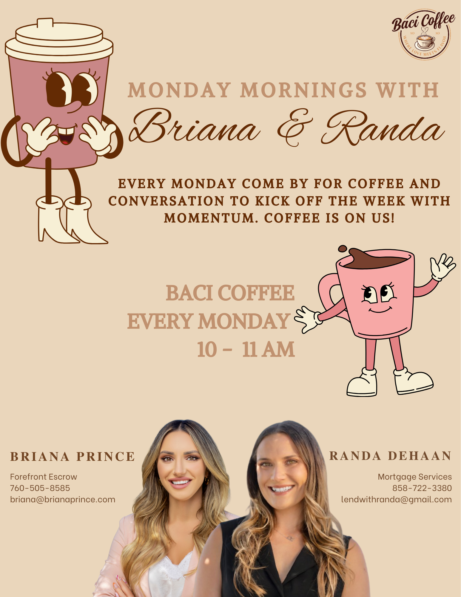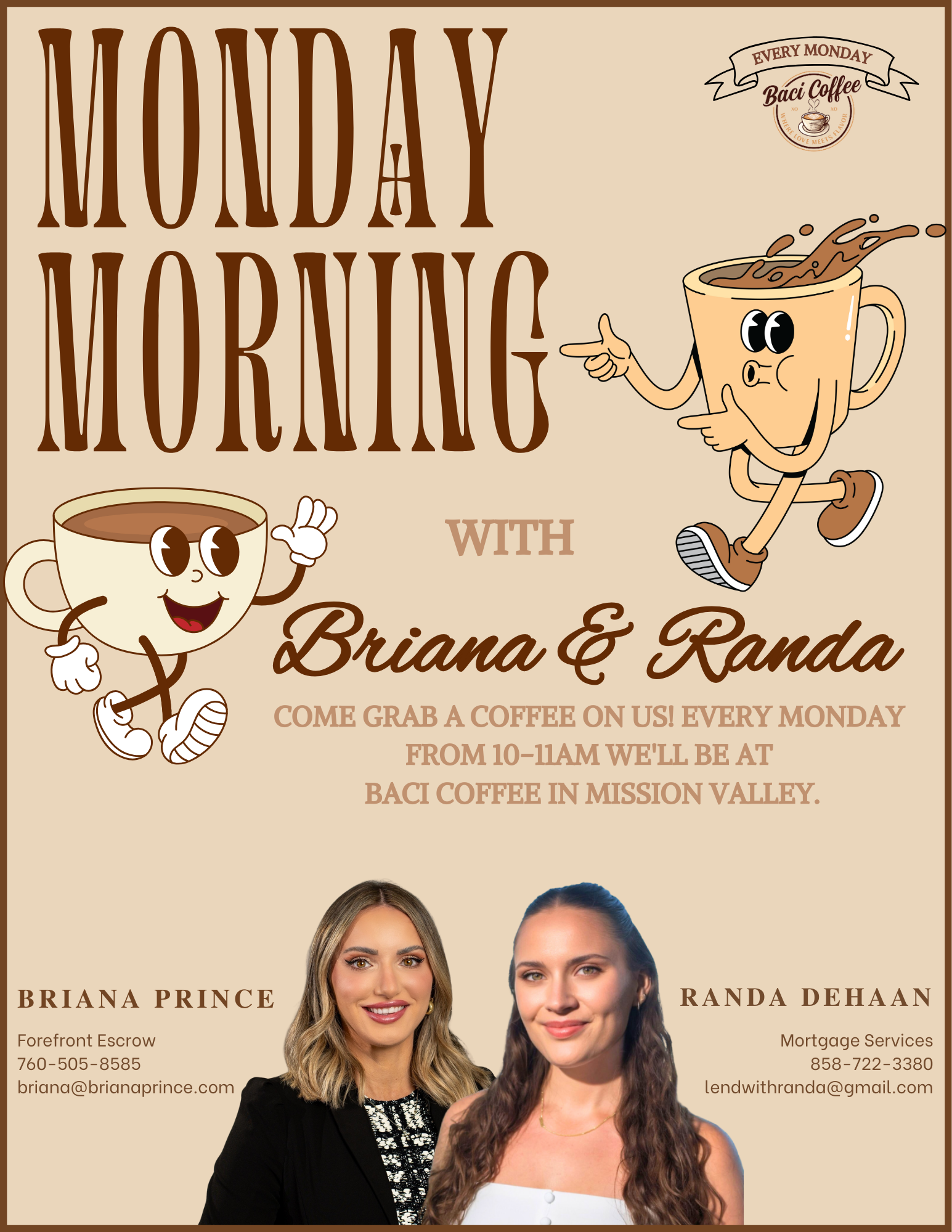 Come grab a coffee on us! Every Monday from 10-11am we’ll be at Baci Coffee in mission valley. Come hang out and let’s talk about mindset and business planning. We want to collaborate & add value to your business! Let’s start the week off with momentum!!